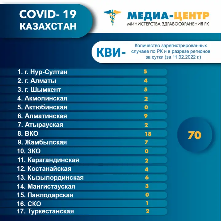 Опубликованы данные о количестве зарегистрированных случаев КВИ- по РК и в разрезе регионов за сутки (11.02.2022 г.).