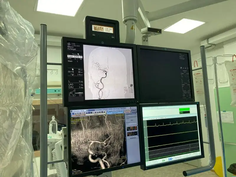 Пациент ранее перенес инсульт, восстановился, но в последнее время состояние здоровья резко ухудшилось. Ему грозило повторное кровоизлияние в мозг из-за утончения сосудов и образования так называемой сосудистой грыжи. Сложность состояния состояла в том, что грыжа образовалась на месте разветвления сосудов. На помощь уральским врачам в Уральск прибыл Максат Мусабеков – ангионейрохирург, врач высшей категории ЦКБ г.Алматы и Центра эндоваскулярной нейрохирургии.
