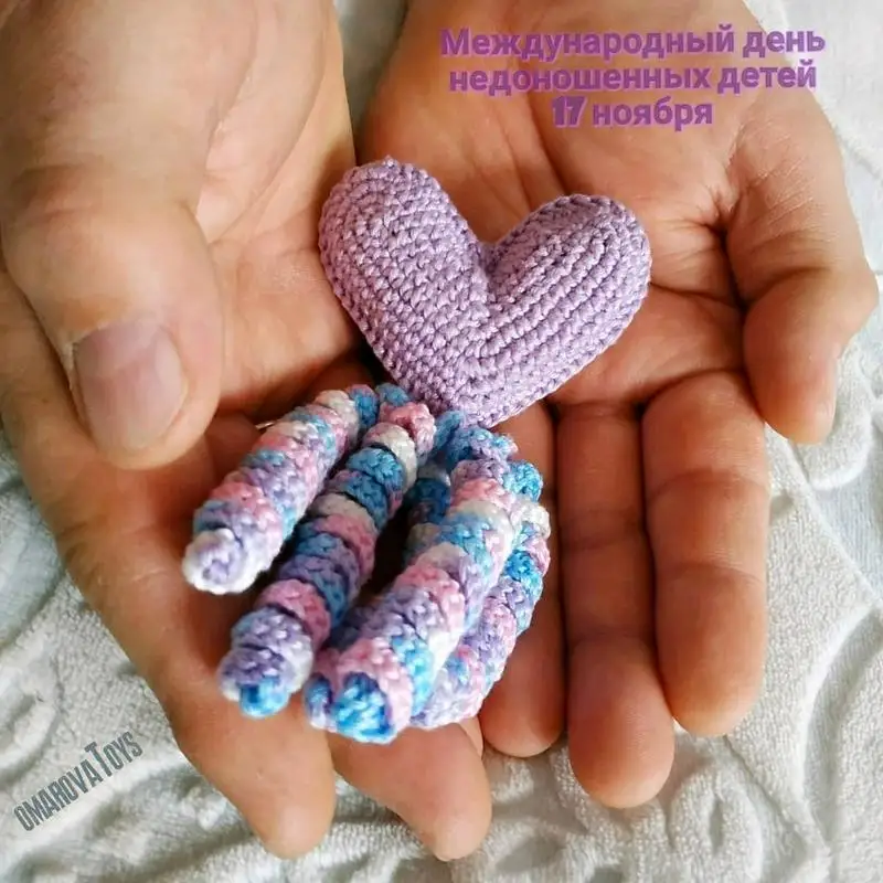 Организатор марафона «Фиолетовые сердечки» Ардак Омарова вяжет крючком забавные игрушки для недоношенных деток. Для участия в акции она предложила всем желающим связать сердечки для торопыжек любых оттенков фиолетового с разноцветными спиральками. Это особая игрушка для недоношенных детей. Спиральки не случайны: они напоминают пуповину.