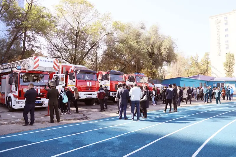Вниманию жителей города Алматы, ветеранов, и учеников алматинских школ продемонстрирована пожарная автолестница, предназначенная для спасения и эвакуации людей из верхних этажей горящих зданий с высоты в 37 метров.