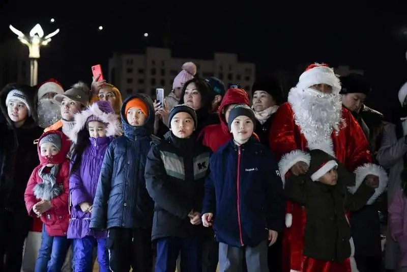 В прекрасный вечер, где звучали красивые песни и танцевали различные сказочные персонажи, Дед Мороз и Снегурочка подарили публике хорошее настроение, особенно малышам. Талантливая певица Айзада Алимбек исполнила песню «Жаңа жыл». Вечер перенес многих в детство и подарил прекрасные впечатления. Детям раздали подарки, туркестанцы и гости города фотографировались у главной елки. Елка установлена за счет спонсоров. Также в Туркестанском культурно-духовном центре и парке «Женис» установлены елки, которые украшены яркими игрушками.