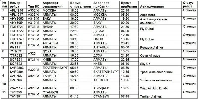 Из/в Алматы, Актау, Туркестана, Актобе отменено выполнение 25 рейсов в/из Москвы, Баку, Дубая, Стамбула, Антальи, Дохи, Киева, Екатеринбурга, Ташкента, Абу-Даби.