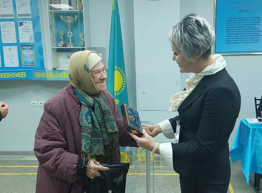 На избирательном участке №454 в Турксибском районе первым голосующим в качестве подарка преподнесли сборник состоящий из книги Абая, ручки, асыка и сувениров.