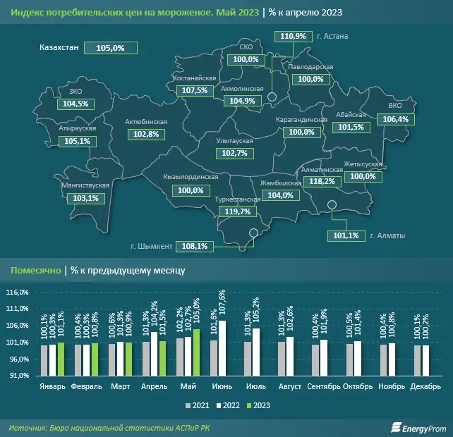 В разрезе регионов РК месячное удорожание составляло от 1,1% в Алматы до 19,7% в Туркестанской области. Заметный рост цен на мороженое также зафиксирован в Алматинской области (на 18,2%) и Астане (на 10,9%). При этом в 5 регионах РК цены не изменились: в Жетысуской, Карагандинской, Кызылординской, Павлодарской и Северо-Казахстанской областях.