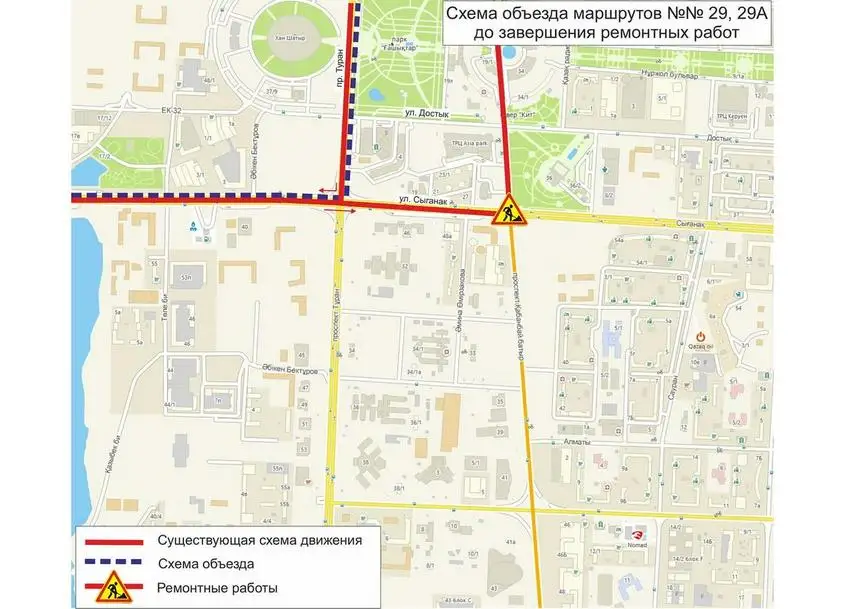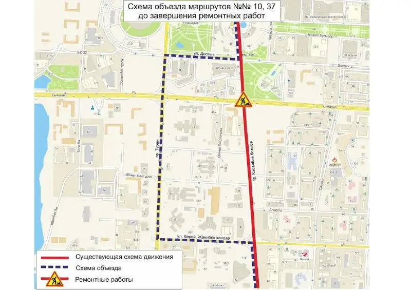 «До завершения ремонтных работ, временно изменены схемы движения маршрутов №№ 10, 12, 29, 29А, 32, 37, 40, 46, 51, 302, 303, 308, 309», - проинформировала транспортная компания «City Transportation Systems».