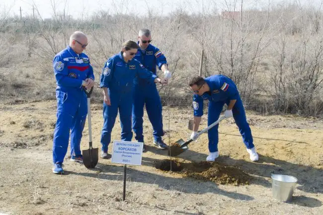 В графике предстартовой подготовки на Байконуре космонавты строго следуют предполётным традициям, это и церемония поднятия флагов стран-участниц космического полета, это и посадка деревьев на знаменитой Аллее космонавтов в Байконуре.