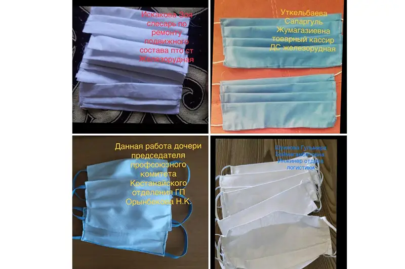 «В период пандемии коронавирусной инфекции COVID-19 и острой нехватки медицинских масок мы решили шить их своими руками. Спасибо председателю профкомитета отделения Нурлану Орынбекову, который обеспечил нас необходимым материалом для изготовления масок: тканью, резинками, нитками. Это наш, железнодорожников, вклад в борьбу с пандемией, мы не могли оставаться в стороне», - сказал осмотрщик-ремонтник вагонов ПТО Железорудная Костанайского отделения ГП Батарбек Атантаев.