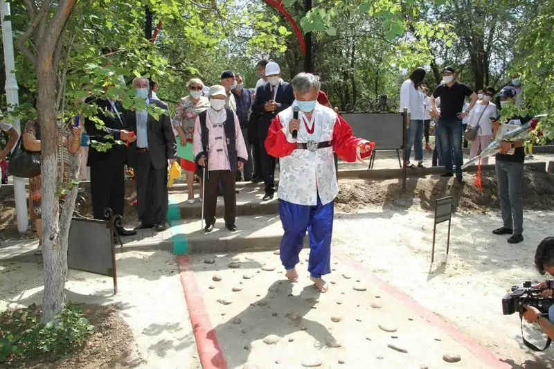 «Название парка символичное, так как уже пять поколений корейцев проживают на земле Приуралья с 1937 года. Так, на стенде в сквере я поместил газету за 1937 год, датированную 9 июля, в которой повествуется о событиях, положивших начало депортации корейцев в Казахстан. Даже каждая скамейка в сквере имеет свой смысл. Например, возле стенда я положил бревно, чтобы образно показать, на чем в свое время чаще всего сидели представители первого поколения, представители второе поколение уже сидели на самодельных лавочках. Видите, она немного кривая. Третье поколение уже присаживалось на более качественные красивые скамейки. Не забыли мы и про молодежь – на большом металлическом сердце могут повесить замочек влюбленные пары. А ключ от замка можно опустить тут же в специальную емкость любви. Есть также в сквере скульптурное металлическое дерево для ленточек желаний, символизирующих благополучие, здоровье. И как доктор я соорудил здесь же дорожку, по которой можно и нужно ходить босиком. А заходят на нее через арочные ворота. Когда мы ходим босиком по камням, бревнам, траве и песку происходит своеобразное лечение организма, – рассказал В. Ан.