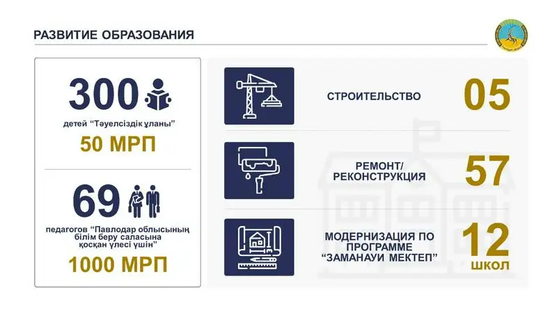 Сфера особого внимания – образование. Аким Абылкаир Скаков часто подчеркивает важность инвестирования в обучение детей и создание необходимых для этого условий. Бюджет образования в регионе значительно вырос, так, в числе прочих позитивных изменений модернизированы 12 школ, а 69 учителей и 300 детей получили учрежденные знаки «Павлодар облысы білім саласына қосқан үлесі үшін» и «Тәуелсіздік ұланы». Разработан региональный Атлас новых профессий, по нему уже проводят обучение в колледжах и профориентацию в школах.