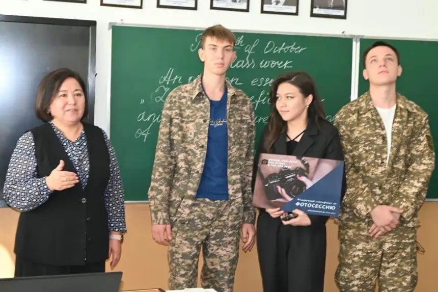 Ученики 11 «Б» класса средней школы №4 города Талдыкорган получили в подарок сертификат на фотосессию для выпускников и картину с пейзажем.