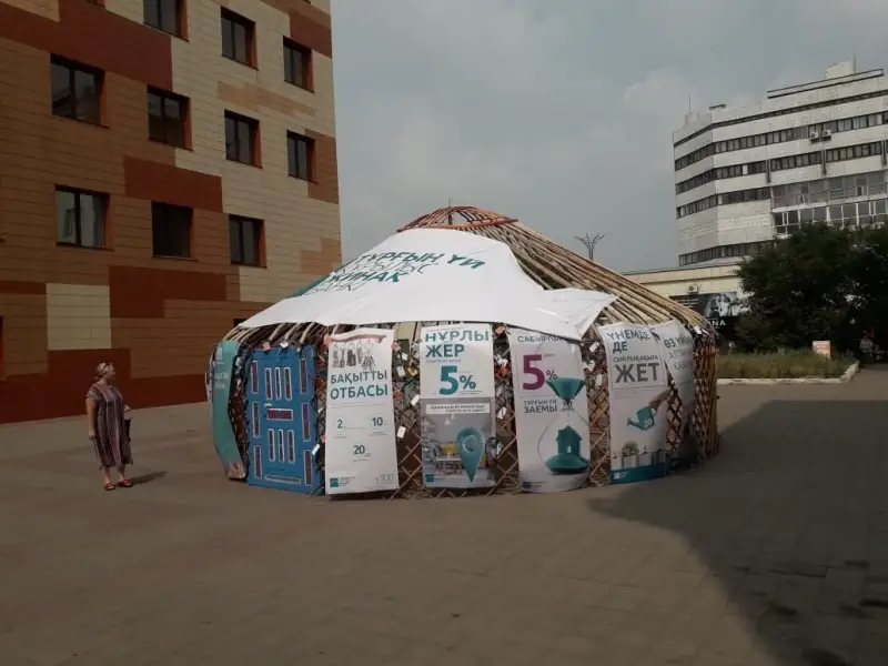 На церемонии открытия сотрудники банка символично собрали перед зданием юрту, и все вместе подняли шанырак.