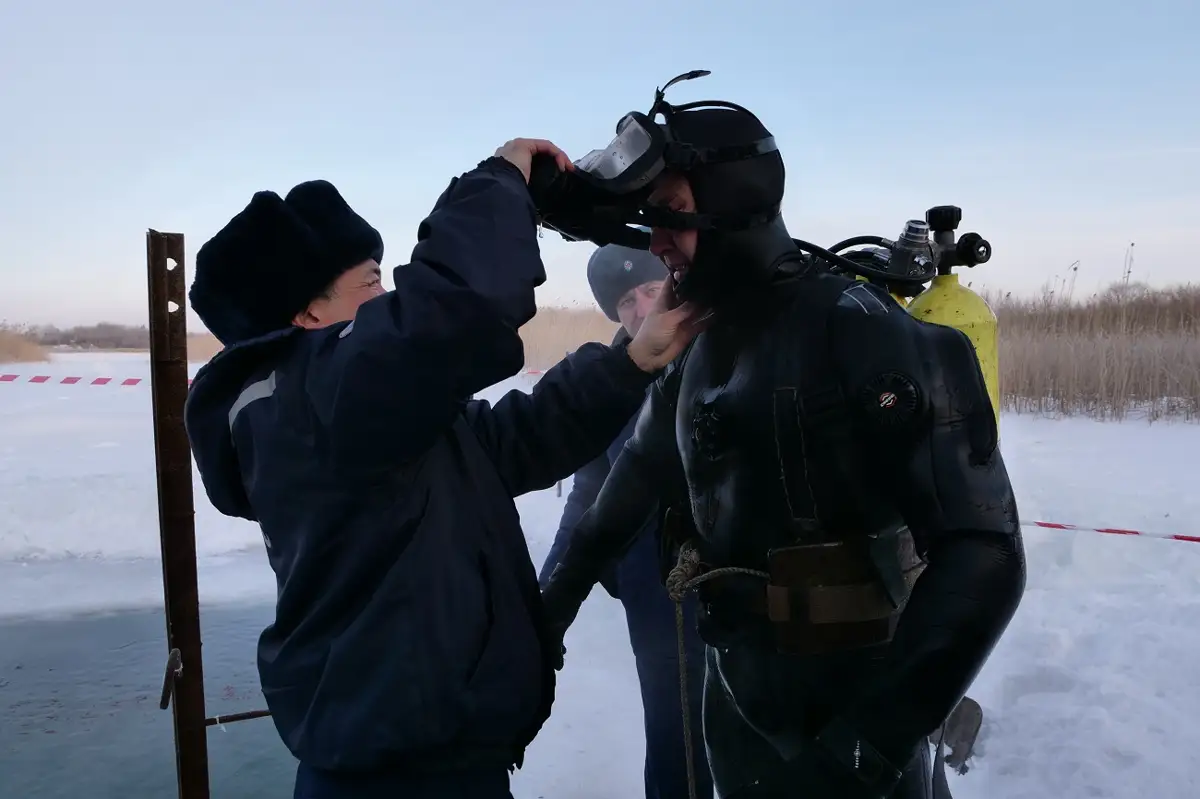 ПЕТРОПАВЛОВСК. КАЗИНФОРМ – В Северо-Казахстанской области полицейские из специального отряда быстрого реагирования целый месяц упражнялись в подледном погружении, передает корреспондент МИА «Казинформ».