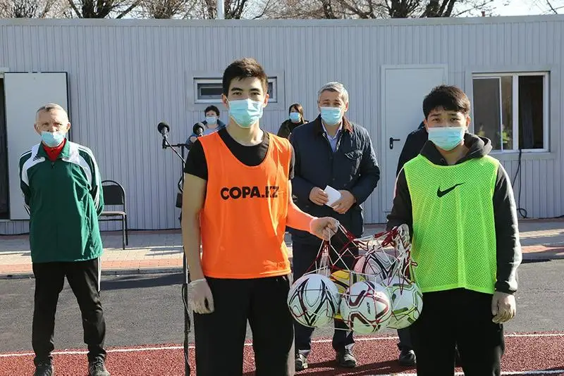 Опробовать новое поле пришли команды дворовых клубов Майкудука. Их капитанам были вручены футбольные мячи.