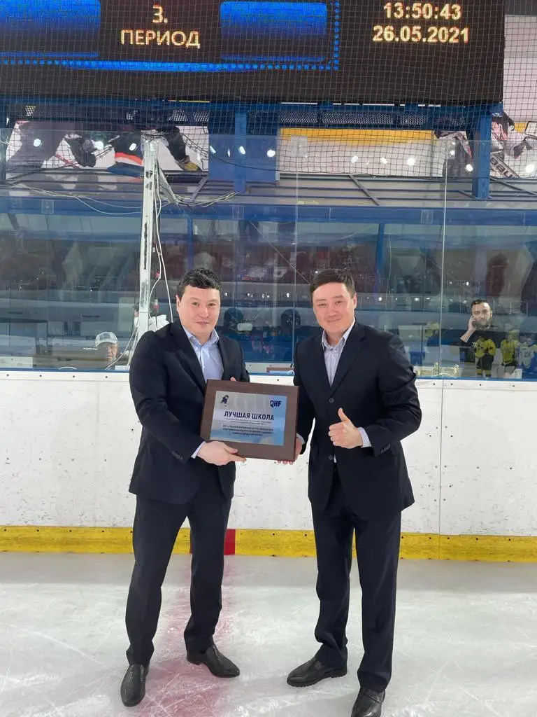 Награду директору школы Талгату Китарову вручил представитель Казахстанской Федерации по хоккею с шайбой Рустам Ибраев.