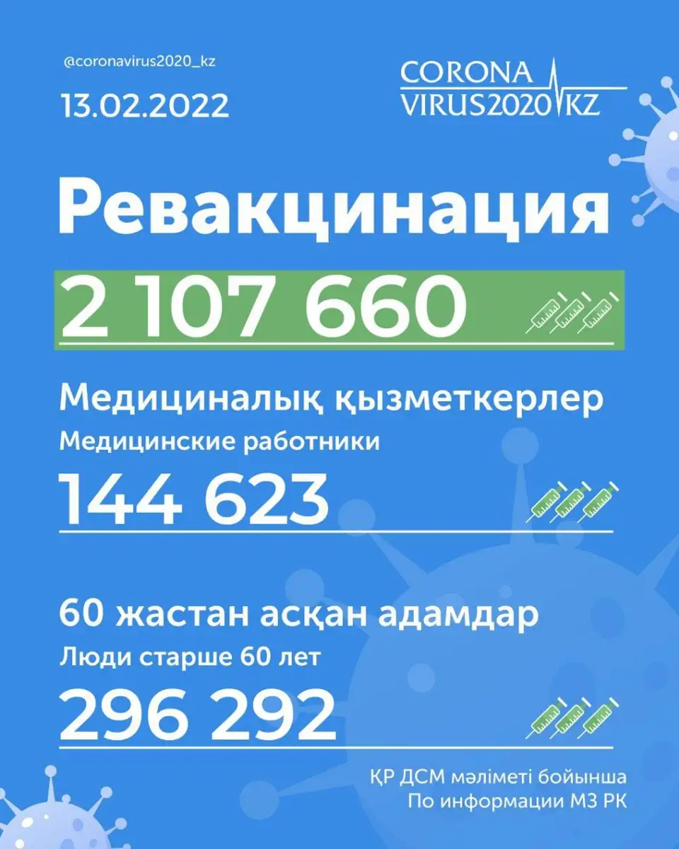 НУР-СУЛТАН. КАЗИНФОРМ - По данным Министерства здравоохранения на 13 февраля, 2 107 660 человек в Казахстане прошли ревакцинацию против коронавирусной инфекции, передает МИА «Казинформ» со ссылкой на Coronavirus2020.kz.