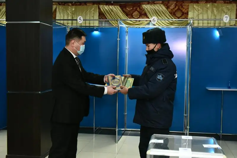 Военнослужащие срочной службы воинских частей и курсанты Военного института Национальной гвардии голосовали в 38 избирательных участках на территориях военных городков. Среди военнослужащих множество, кто впервые принял участие в голосовании. Самым первым избирателям в воинских частях были вручены специальные подарки. К примеру, в столичной воинской части 5573 солдатам вручили книгу Абая.
