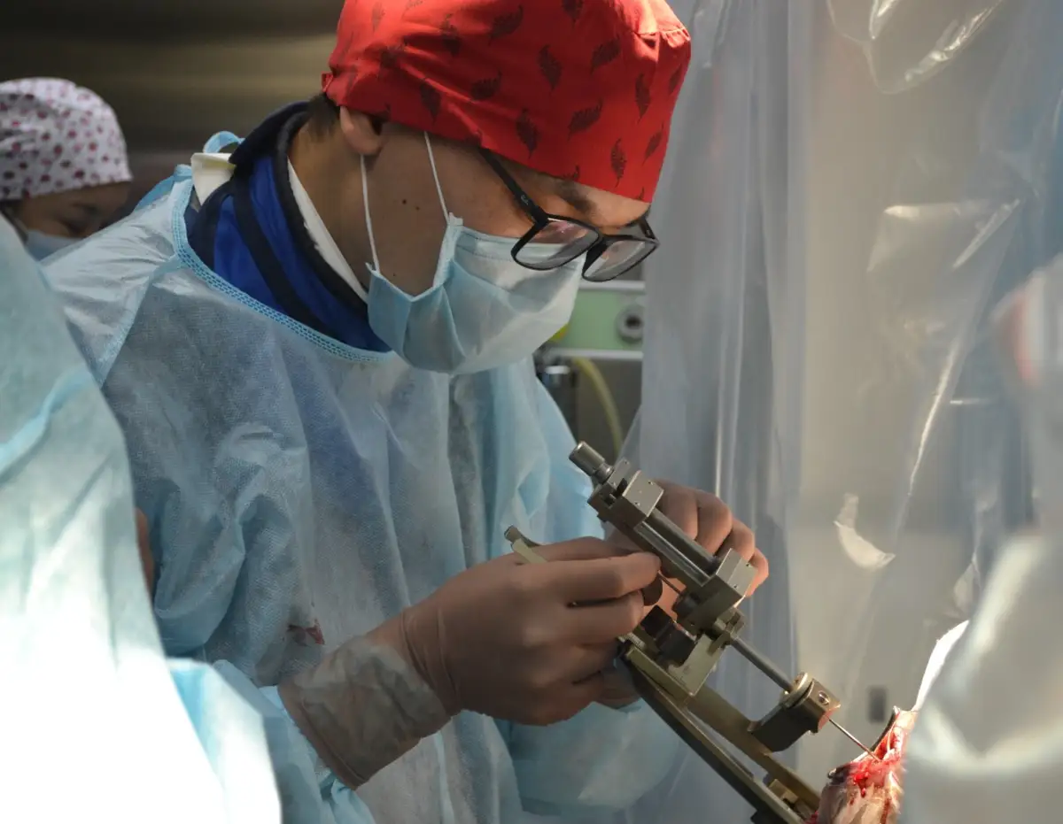 Оперировавший врач нейрохирург Отделения сосудистой и функциональной нейрохирургии Нуриманов Чингиз Сагадатович охотно рассказал о сути самой операции. «Операция проводилась по квоте, в рамках ОСМС. Мы провели пациенту операцию «стереотаксическая таламотомия справа». Иными словами, пациенту глубоко в центр мозга через череп, в субталамическое ядро ввели крошечные электроды, по которым идёт ток. Устройство глубоко стимулирует работу пострадавших от заболевания клеток мозга. Импульсы поступают прямо в поврежденные части мозга и разгоняют их деятельность. Таким образом, это позволяет снять симптомы болезни Паркинсона и замедляет её течение», - пояснил врач нейрохирург Чингиз Сагадатович.